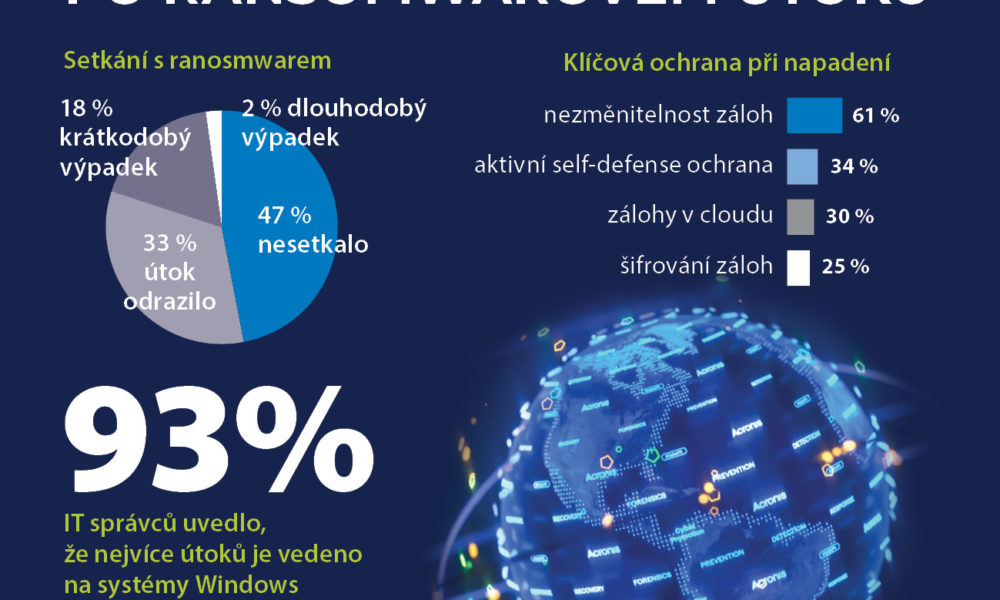 Acronis, globální lídr na trhu řešení kybernetické ochrany, představil výsledky průzkumu, podle kterých 20 % českých organizací zažilo během posledních 12 měsíců výpadek provozu v důsledku ransomwarového útoku. Ransomwarovému útoku čelila zhruba polovina českých organizací, třetina útok dokázala odrazit, ve zbylých případech bohužel došlo z k zašifrování dat a výpadkům provozu včetně aktuálně nejznámějšího případu Ředitelství silnic a dálnic (ŘSD).