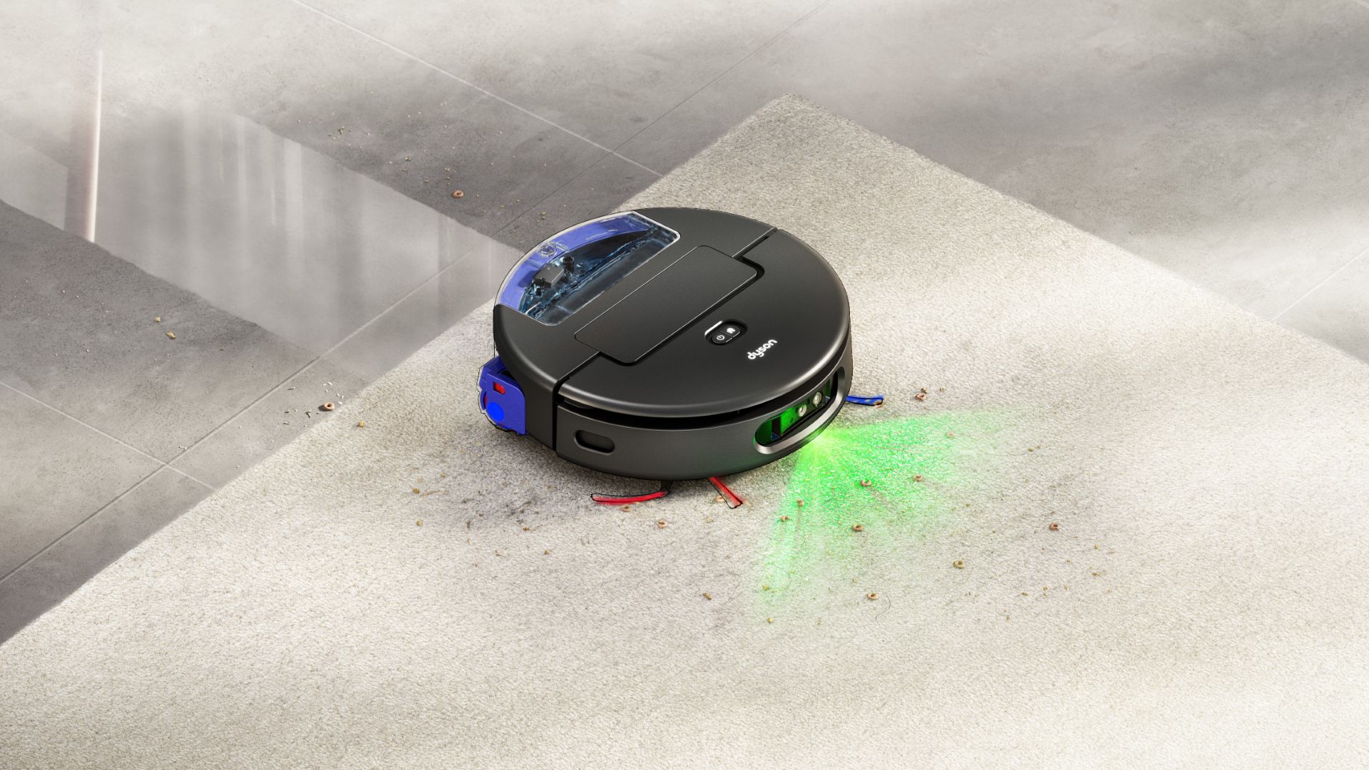 Dyson Spot+Scrub Ai přistupuje k úklidu ve třech krocích – podobně jako když čistíte skvrnu ručně. Inteligentní systém využívá kombinaci zeleného laseru a AI kamery k odhalení i neviditelných nečistot, na které okamžitě reaguje úpravou čisticího výkonu v reálném čase.